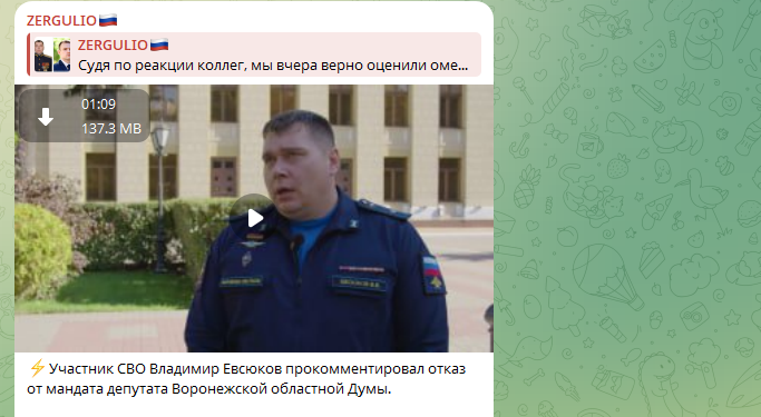 Голосовали люди за ветерана СВО. И семьи жителей Воронежской области, чьи близкие сейчас воюют, были ранены или погибли — голосовали за ветерана. А кого выбрали в итоге? — задает вопросы Сергей Колясников в своем канале "Zergulio".