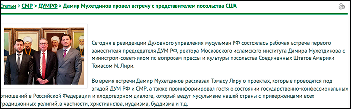 Примечательно, что спустя два месяца муфтий принял у себя на рабочем месте теперь уже советника по вопросам прессы и культуры посольства США Томаса Лири.