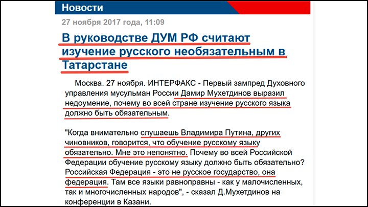 Вот так — ни больше не меньше: и государственный русский язык Мухетдинов считал необязательным для изучения, и глава государства у него был в одном ряду с "другими чиновниками"…