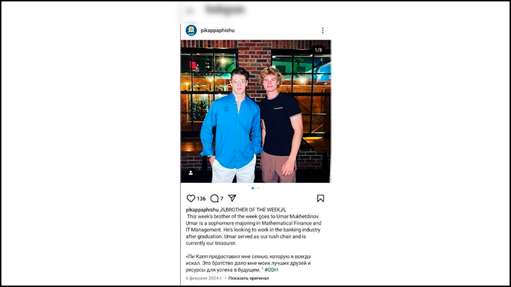 Умар Мухетдинов уютно чувствует себя в американском университете. Скриншот: аккаунт pikappaphishu в социальной сети Instagram*