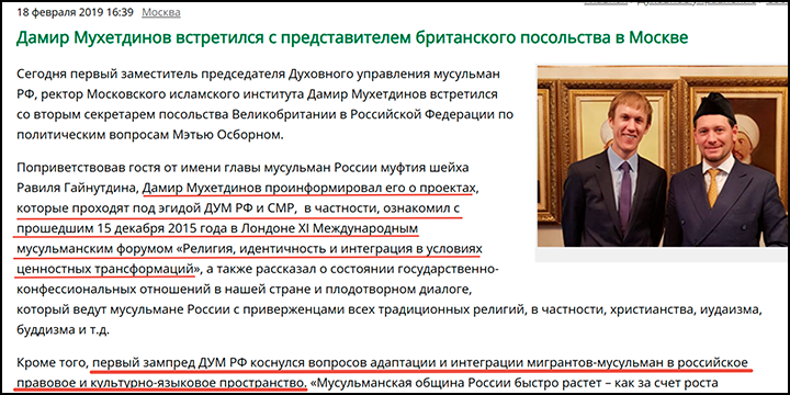 В 2019-м, например, к нему заглядывал "на чаепитие" второй секретарь посольства Великобритании по политическим вопросам Мэтью Осборн. Да-да, это не опечатка — с религиозным деятелем встречался чиновник английского МИД по политическим вопросам. И Мухетдинов отчитывался перед посланцем из Лондона о том, каково "состояние государственно-конфессиональных отношений в России" и как проходит "интеграция мигрантов-мусульман в российское правовое и культурно-языковое пространство".