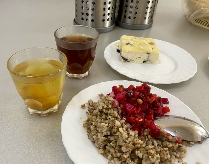 В окна столовой на первом этаже словно украдкой проникало утреннее весеннее солнышко. В его лучах блестели стеклянные стаканы с ярким компотом из сухофруктов. Картинка тёплая и ностальгическая. А когда я узнала, что сегодня в меню ещё и та самая каноническая творожная запеканка с изюмом, честно скажу, расплылась улыбкой.