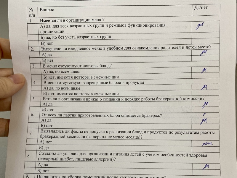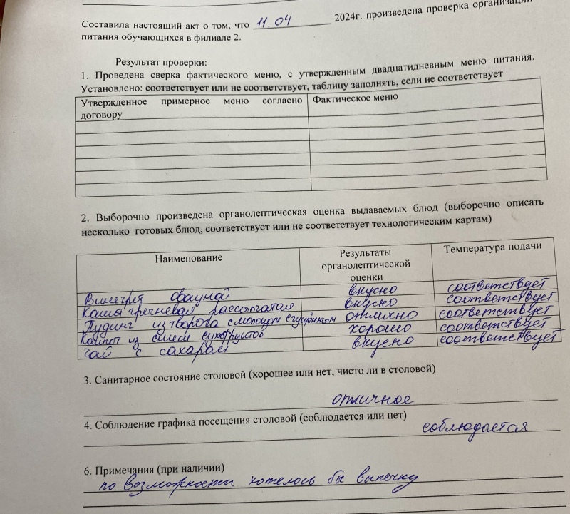 После дегустации заполняем отчётную форму. Меню имеется, повторы блюд отсутствуют, в столовой чисто, есть умывальники для детей…