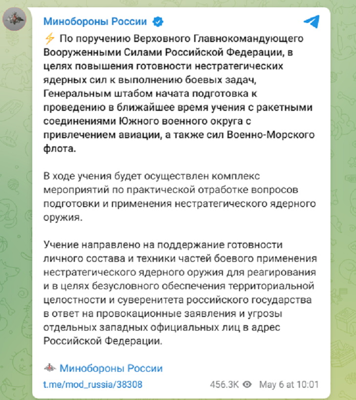 Учение направлено на поддержание готовности личного состава и техники частей боевого применения нестратегического ядерного оружия для реагирования и в целях безусловного обеспечения территориальной целостности и суверенитета Российского государства в ответ на провокационные заявления и угрозы отдельных западных официальных лиц в адрес Российской Федерации,