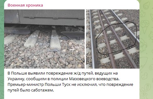 Стоит отметить, что повреждённое железнодорожное полотно на участке Демблин-Варшава в районе станции Мика Гарволинского района Мазовецкого воеводства находится на линии путей, ведущих из Польши на Украину.