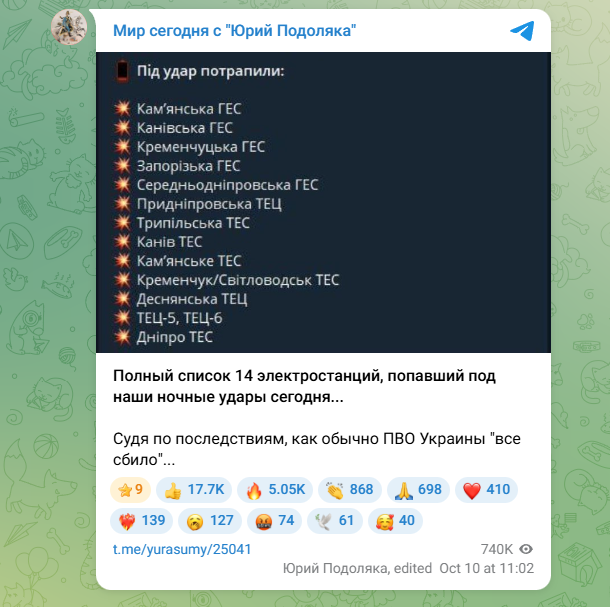 В Киеве перебои в работе метро и некоторых поездов из-за отсутствия электричества. Военный блогер Юрий Подоляка сообщил о том, что были поражены сразу 14 крупных электростанций Украины.