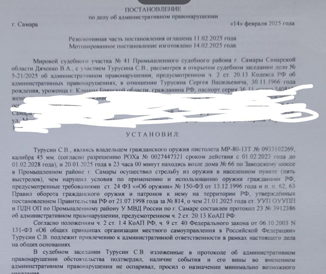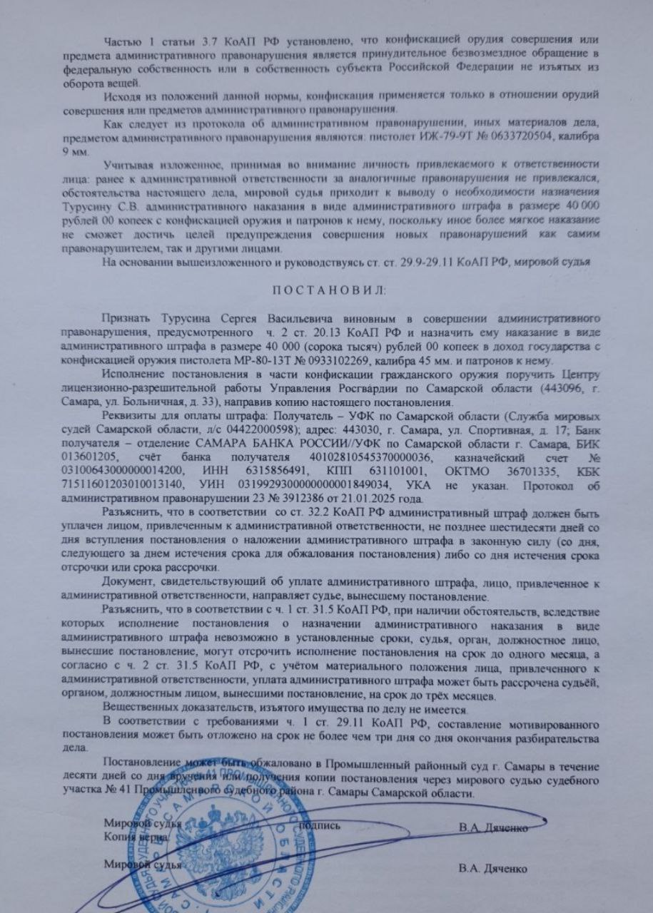 Заместитель начальника отдела полиции (фамилия выясняется) и старший лейтенант Максин Максим Владимирович вызвали Турусина в следственный комитет и настояли на его подписи в протоколе о стрельбе в общественном месте. Они утверждали, что это всего лишь формальность, хотя Турусин был жертвой нападения. Матвеев указал на то, что мировой судья Дяченко вынес решение о виновности Турусина без проведения судебного заседания и даже не учёл его доводы о самообороне.