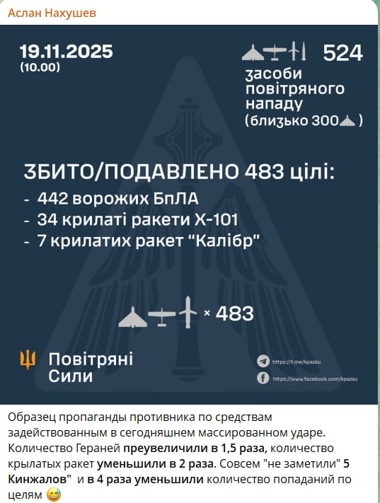 Как сообщил полковник Аслан Нахушев, противник преувеличил число запущенных по нему "Гераней" в 1,5 раза (разницу, естественно, записал в сбитые), а вот количество ракет Х-101 приуменьшил в два раза. Совсем "не заметили" пять "Кинжалов" и в 4 раза уменьшили количество попаданий по целям.