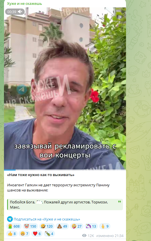 Бурное недовольство у артиста вызвало то, что на несколько дней раньше в Лимасол приедет с выступлением комик Галкин**. Панин* запереживал: народ сходит на юмориста, а на следующую труппу кочующих иноагентов уже не захотят. Не секрет, что беглые артисты не сильно востребованы за границей, так что, похоже, драться готовы за каждого платежеспособного зрителя.