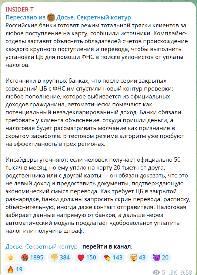 Если человек получает официально 50 тысяч в месяц, но ему упало на карту 20 тысяч от друга, родственника или с другой карты - он обязан доказать, что это не левый доход, и предоставить документы, подтверждающие экономический смысл перевода. Как требует ЦБ в закрытой разнарядке, банки должны запросить скрин перевода, расписку, объяснительную, иногда даже контакт отправителя. Налоговая забирает данные напрямую от банков, а дальше через автоматический модуль предлагает "добровольно" уплатить налог или получить штраф.