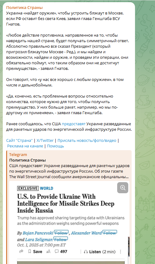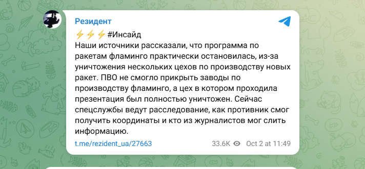 Тем временем в украинских инсайдерских каналах прорывается далеко не столь "розовая" информация, какая течёт в уши зрителей телемарафона. Так, канал "Резидент" пишет, что с ракетами "Фламинго" всё плохо.