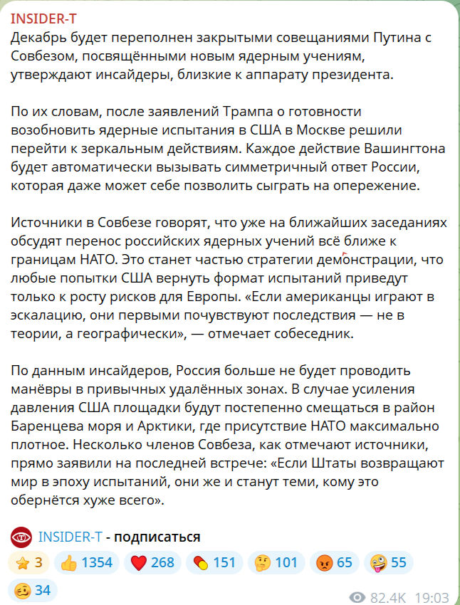 Источники в Совбезе говорят, что уже на ближайших заседаниях обсудят перенос российских ядерных учений всё ближе к границам НАТО. Это станет частью стратегии демонстрации, что любые попытки США вернуть формат испытаний приведут только к росту рисков для Европы. "Если американцы играют в эскалацию, они первыми почувствуют последствия - не в теории, а географически",