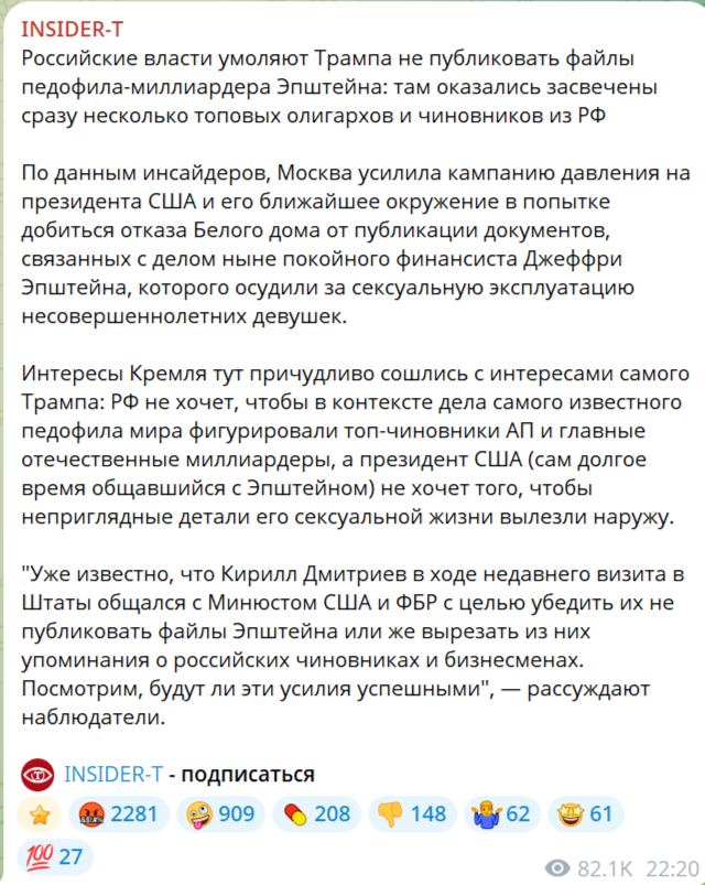 Российские власти умоляют Трампа не публиковать файлы педофила-миллиардера Эпштейна: там оказались засвечены сразу несколько топовых олигархов и чиновников из РФ,