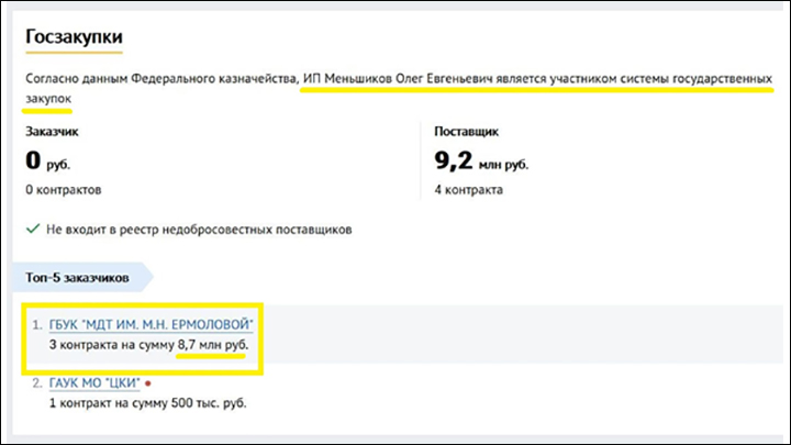 При этом Меньшиков тоже имеет свой ИП, который ранее продавал свои услуги собственному театру через систему госзакупок. Сегодня коммерческая структура по-прежнему работает.
