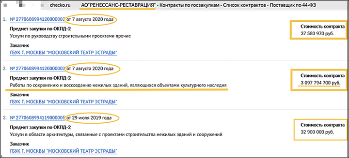 В оформленном через систему госзакупок договоре между Театром эстрады и АО "Ренессанс-Реставрация" цифры, разумеется, совсем другие – 3,2 млрд рублей. Но это – полная сумма, цена всех трёх госконтрактов на реставрационные работы.