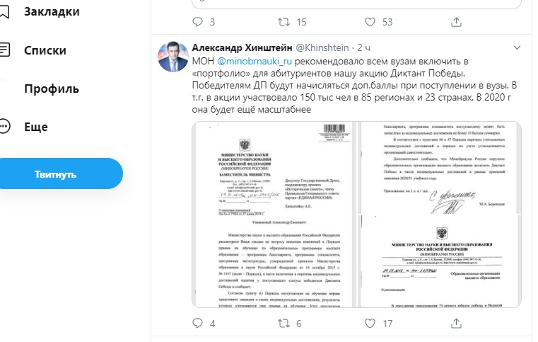 "МОН рекомендовало всем вузам включить в "портфолио" для абитуриентов нашу акцию Диктант Победы, - пишет Хинштейн. - Победителям ДП будут начисляться дополнительные баллы при поступлении в вузы. В акции участвовали 150 тысяч человек в 85 регионах и 23 странах. В 2020 году она будет ещё масштабнее".