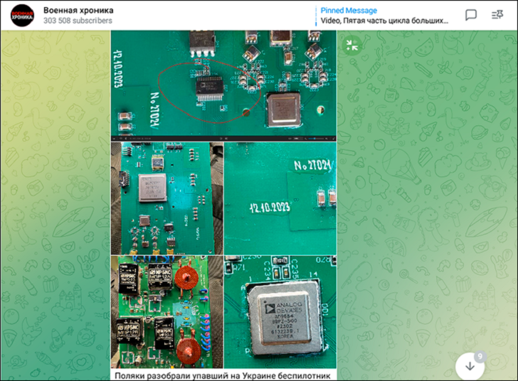 На фото красным обведён высокоскоростной двухканальный АЦП AD9684, преобразующий аналоговый сигнал эфира в цифровой код, который может анализировать компьютер, сравнивая с другими кодами, записанными в базе данных. Скриншот: ТГ-канал "Военная Хроника"