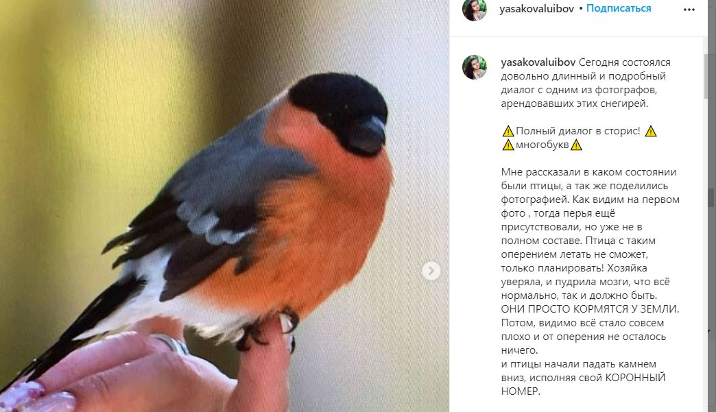 Пригляделась Ольга повнимательнее: у снегирей удалены маховые перья и ампутированы крылья! На снимках увидела птичий помет зеленого цвета. А это верный признак того, что птица больная.