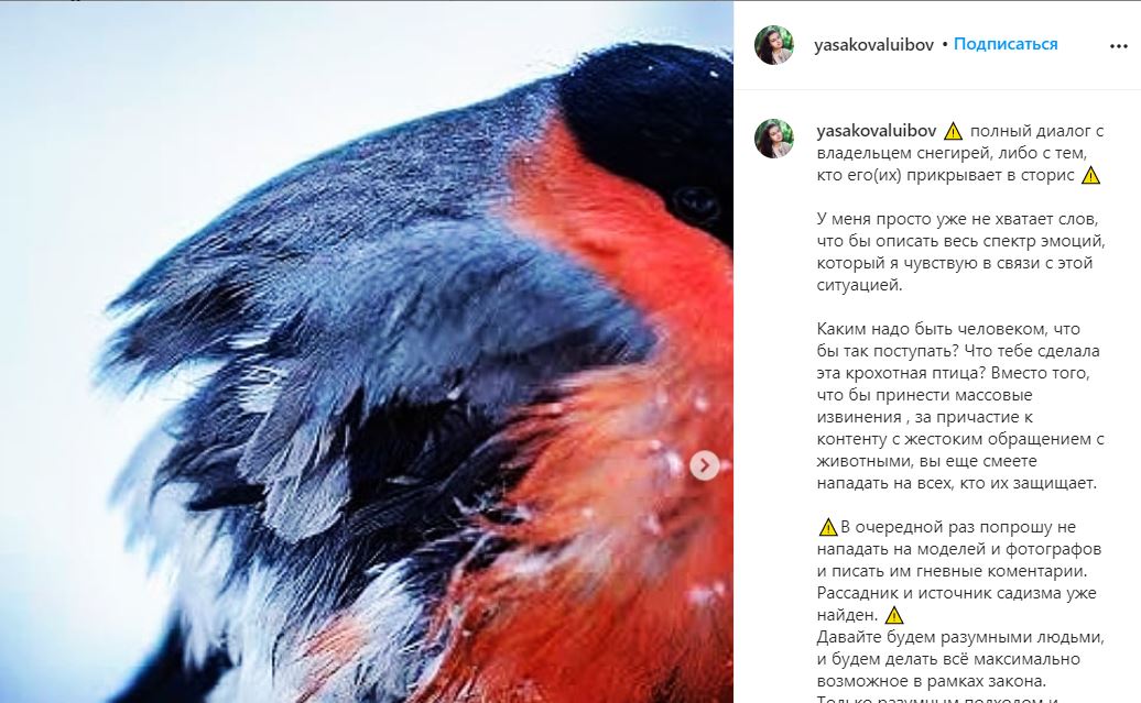 С недавних пор встала Ольга на тропу войны в защите птичьих прав. Попались ей в интернете фотосессии в стиле "а-ля рюс": морозные пейзажи, снег, девицы в мехах, а в их руках — снегири. Смотрятся кадры эффектно: красногрудые птицы, что брошки на белом фоне.