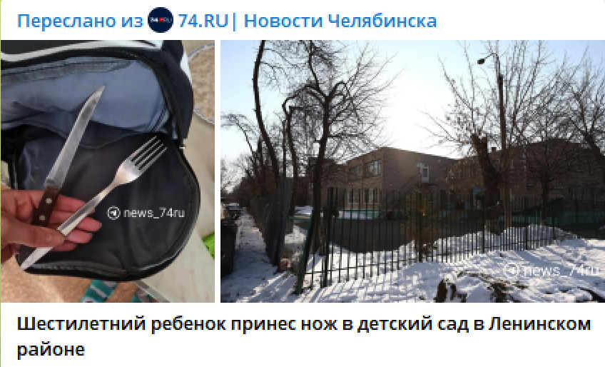 — Мальчик принёс в рюкзаке нож и вилку, родители были не в курсе. Сам он его не доставал, угроз никаких не высказывал. Увидела нож воспитатель, — рассказали в полиции.
