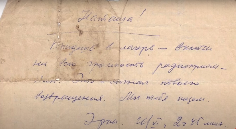 — Наташа! Выйдешь в лагерь — включи на всю громкость радиоприемник. Это сигнал твоего возвращения. Мы тебя ищем. Эрик. 16.06., 2 ч.45 м.