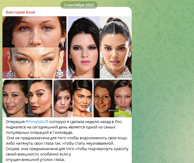 «Я нашла врача, который делал Белле Хадид «лисьи глазки». Это он придумал эту методику, которую многие стали повторять, но очень часто, к сожалению, не совсем удачно. Это его авторская методика, которая называется ponytail lift это когда будто натягиваешь волосы в хвостик», — написала Боня.