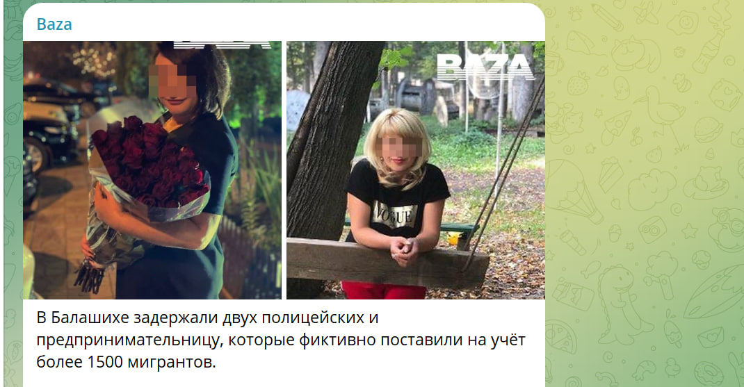 Телеграм-канал BAZA сообщает, что шуровала молдаванка с января 2022 года. В преступном бизнесе участвовали майор полиции и капитан, работавшие в отделе по вопросам миграции, они фиктивно ставили иностранных граждан на миграционный учёт. При обыске у майора нашли более 3 млн рублей и копии миграционных карт.