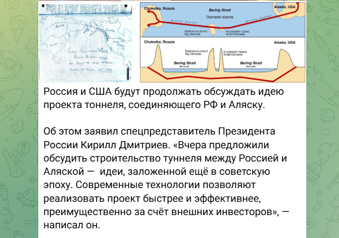 Идея соединить два континента тоннелем под Беринговым проливом неожиданно получила новое дыхание. Спецпредставитель президента России Кирилл Дмитриев официально подтвердил, что Москва и Вашингтон продолжат обсуждать этот амбициозный проект.