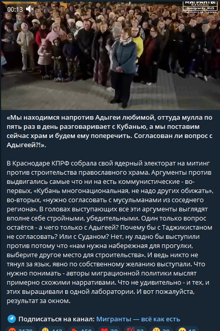 Телеграм-канал "Мигранты - всё как есть", саркастически спрашивает, почему строительство храма митингующие предлагают согласовывать только с Адыгеей? Может быть, стоит ещё Таджикистан и Судан спросить?