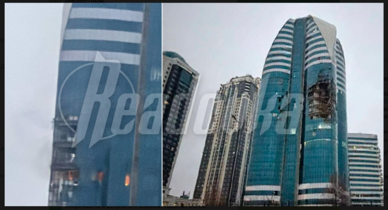 Как известно, Грозный-Сити расположен в самом центре чеченской столицы. Вскоре после прилёта внутри небоскрёба произошёл пожар. На видео, появившихся в сети, можно заметить серьёзные повреждения остекления на нескольких этажах, а также пламя, чёрный дым и копоть.