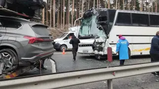 Автобус с полусотней детей столкнулся с груженым автовозом на трассе.
