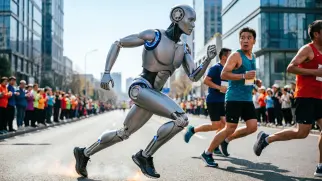 В то время как тысячи бегунов-людей и более 300 человекоподобных роботов вышли на старт полумарафонских...